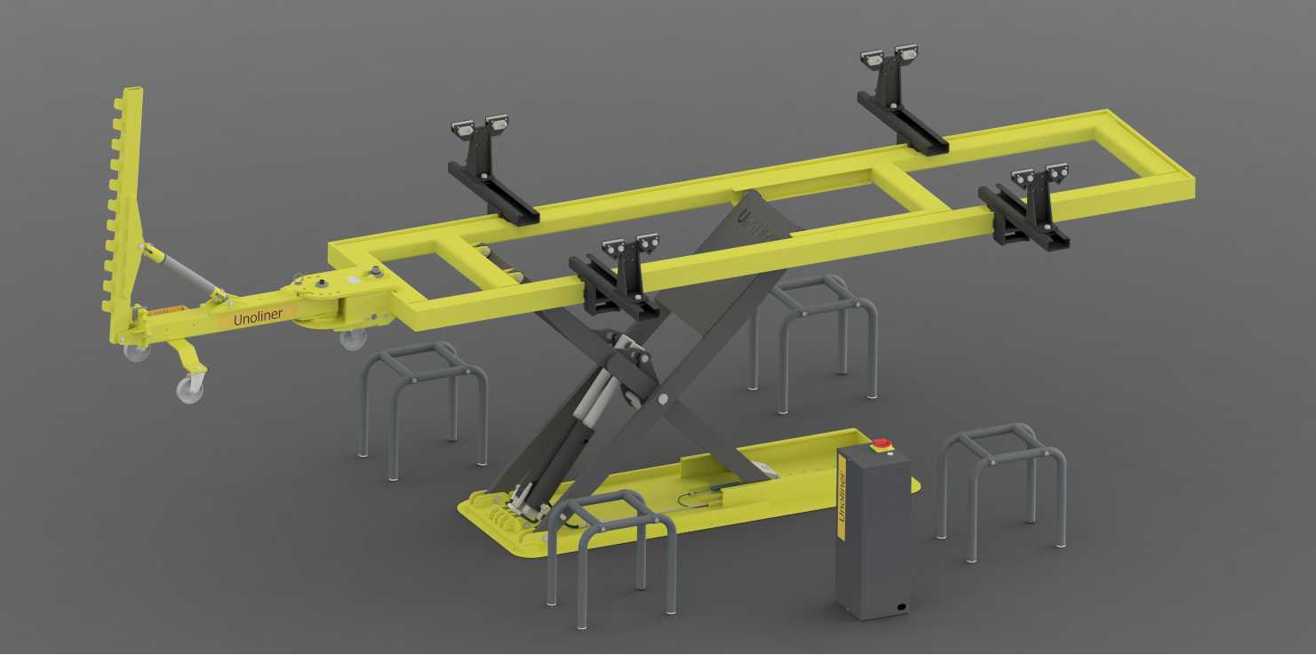 UnoLiner QRS3600 Quick Repair System Set. Low cost and Compact collision repair bench with a lift capacity of 3000 kg . Fits in even the smallest Auto body shop. Compact, versatile and complete, the QRS3600 Quick Repair System Set is the ideal entry-level chassis straightening and collision repair system. Also great as a multifunctional vehicle maintenance and general repair workbench. The UnoLiner QRS3600 is a complete chassis straightening set consisting of the F36V300 3,6m Bench Frame with LA250 3000 kilo lift with pump, BA15 Bench adapters, BA25 Bench arms with rubber block, CA15 Universal sill Clamps, H10 Wheel stands and P6UL 6 Ton Pulling Tower incl. hydraulics